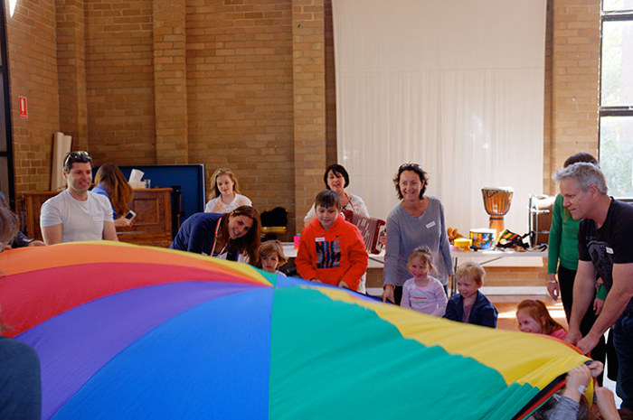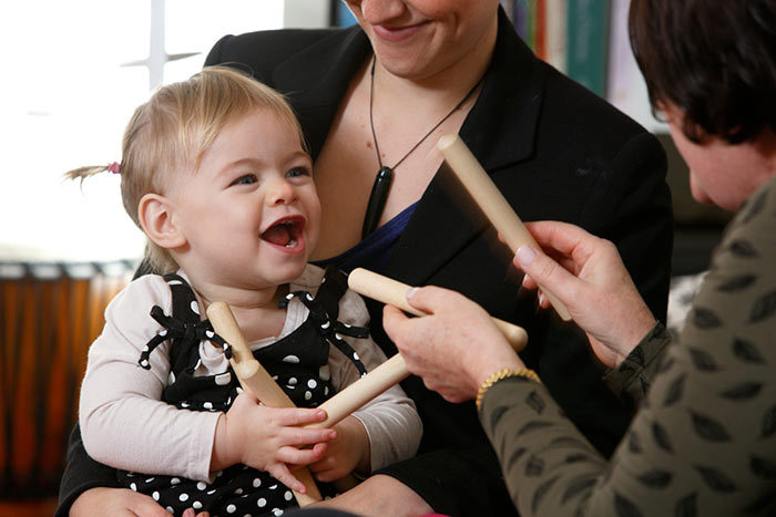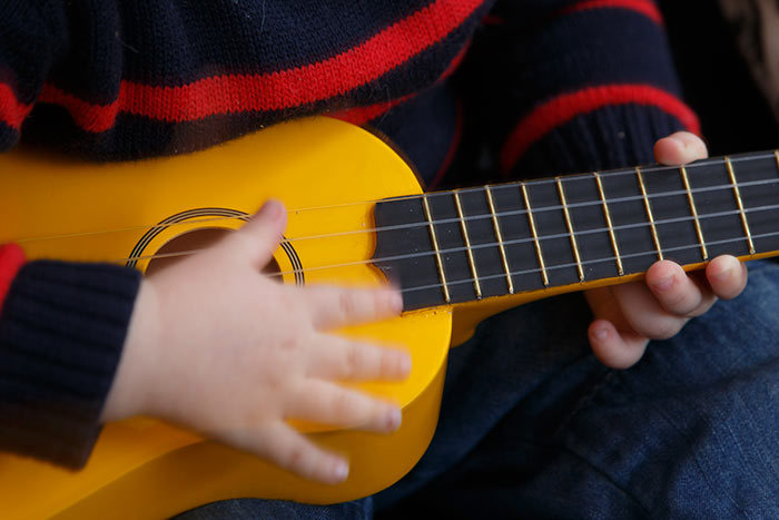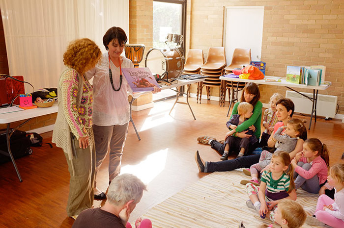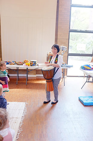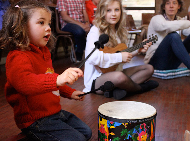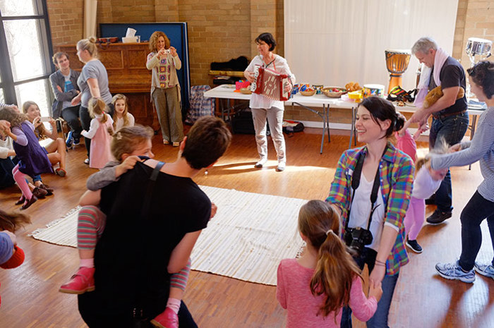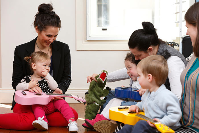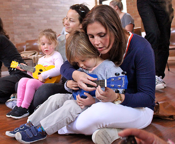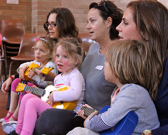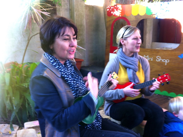 Child Care Centre-Jo and Vesma play ukulele for a child's birthday celebration